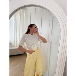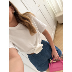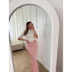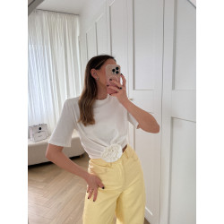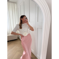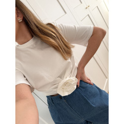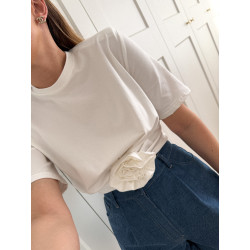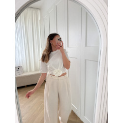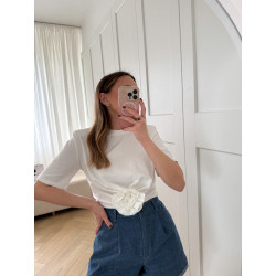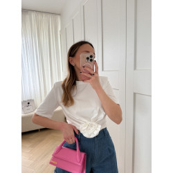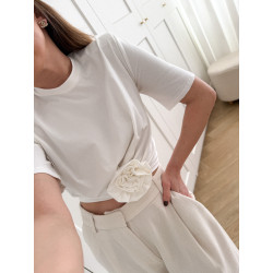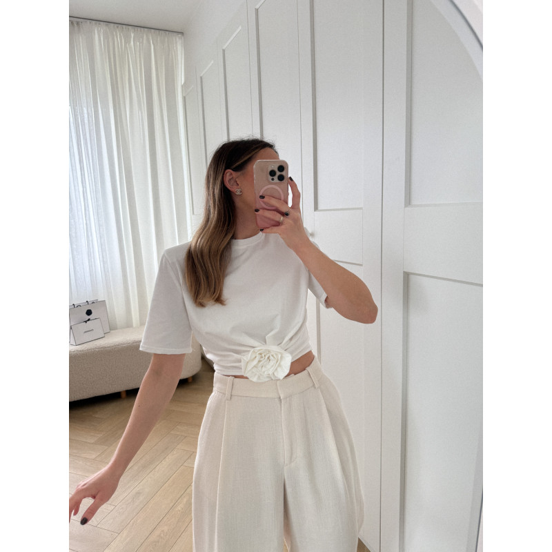 Minimalistyczna forma została przełamana wyjątkowymi akcentami – poduszki na ramionach subtelnie podkreślają linię sylwetki i dodają całości wyrazistego charakteru. Ozdobna róża umieszczona u dołu bluzki to elegancki detal, który można odczepić, zmieniając styl z bardziej romantycznego na klasyczny i prosty.