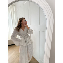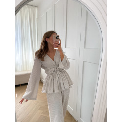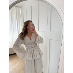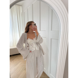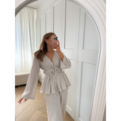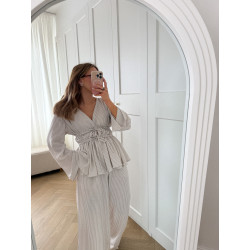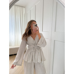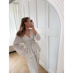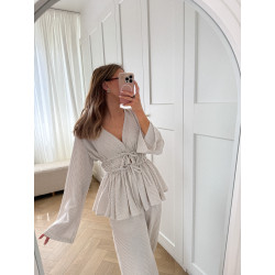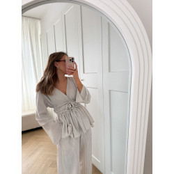 Do kompletu dołączona jest wyjątkowa koszula/narzutka, która przyciąga uwagę swoją formą. Wiązana w talii na dwie kokardki, delikatnie modeluje sylwetkę i nadaje stylizacji romantycznego charakteru. Marszczenia, szersze rękawy oraz subtelne poduchy na ramionach tworzą modny efekt objętości i dodają całości wyrazistości.